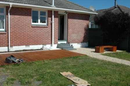Acheter une maison, le pied! Ca implique des rénovations, que du bonheur! On a commençé par les trucs facile: l'extérieur avec le "deck". Quelques planches de bois, quelques cailloux et hop! la classe! |