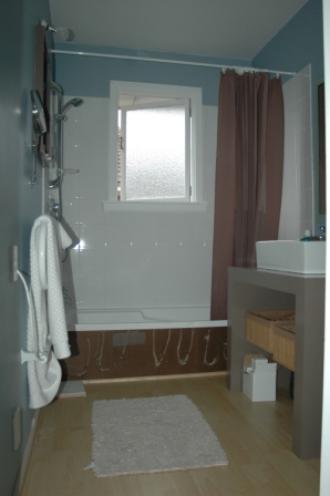 Puis nous nous sommes attaqués à la salle de bain. Un peu la galère quand même... on a tout enlevé, refait les murs, etc. Assez satifait du résultat quand même. Tout n'est pas terminé mais après 2 mois à bosser dedans on fait un break (et oui! 2 mois sans se fouler!!!). |